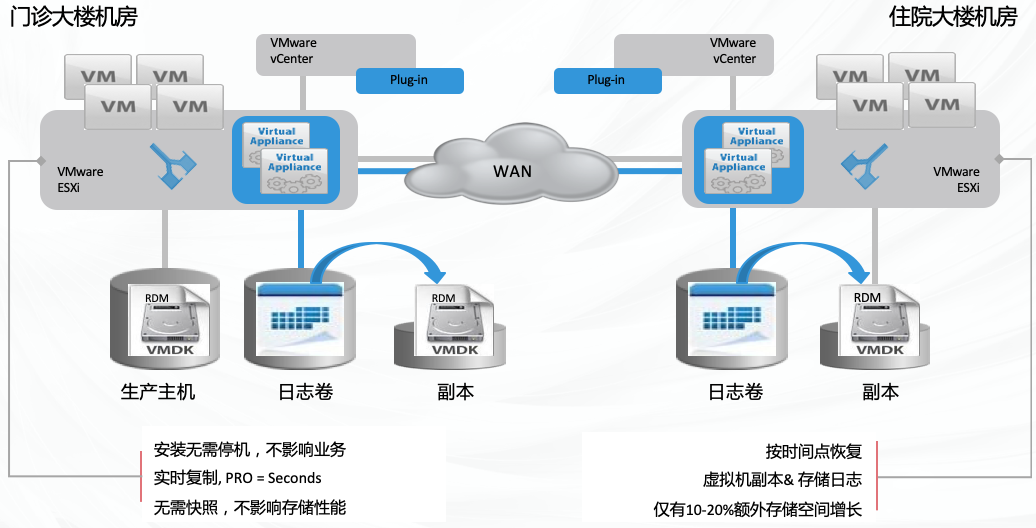 院區(qū)內(nèi)兩個機(jī)房需要協(xié)同保障業(yè)務(wù)連續(xù)性,同時要能防范因人為誤操作導(dǎo)致 重大損失的災(zāi)難,并能決速恢復(fù)系統(tǒng)。